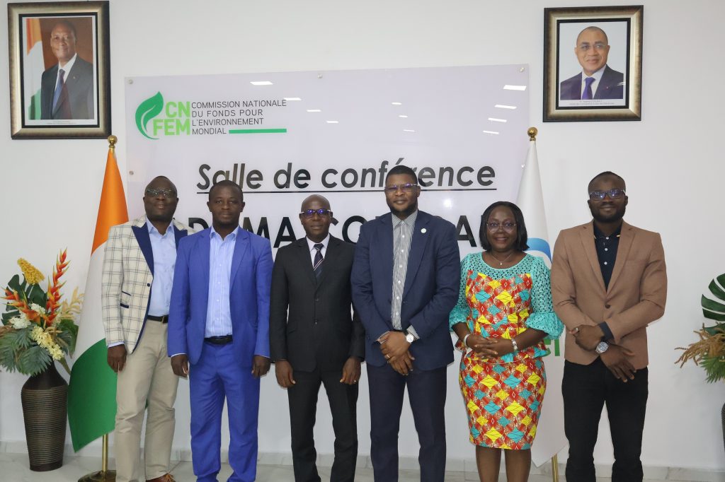 Entouré de Messieurs Kra Bernard et Diomandé Ismaël, tous deux membres du Département Technique, Monsieur Ouattara Allassane a ensuite présenté à la délégation le Fonds pour l’Environnement Mondial (FEM), ses domaines d’intervention, ses guichets de financement ainsi que son mécanisme d’accès aux ressources.